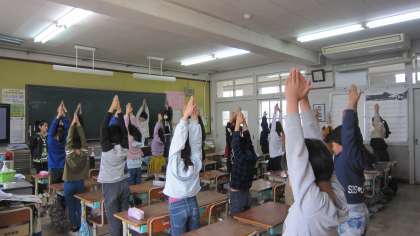 姿勢を一人ひとり確認した後,みんなで,姿勢が正しくなる「とうもろこし体操」をしました。