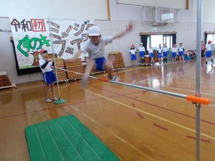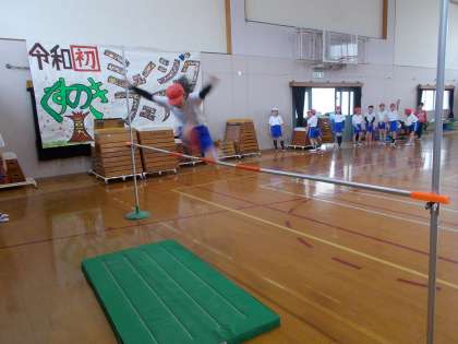 50cmから100cmまでの高さを用意し,自分が挑戦できる高さを飛び越えます。
