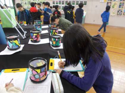 図工展を鑑賞し,自分の作品の工夫したところや頑張ったところを振り返りました。