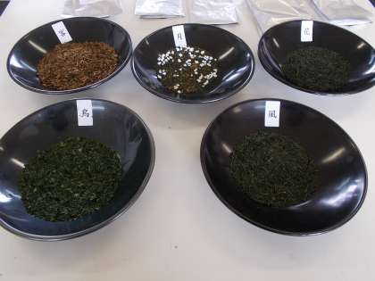出てくるお茶【茶】を,色と香り【香】と口に服んだときの味【服】で,どれがどの種類のお茶かをあてる,利き酒ならぬ利き茶です。