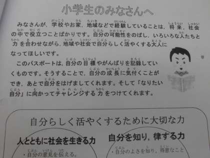 このパスポートは,自分の目標や頑張りを記録していくもので,小学校から中学校へと1冊のファイルとして持ち上がっていくものです。