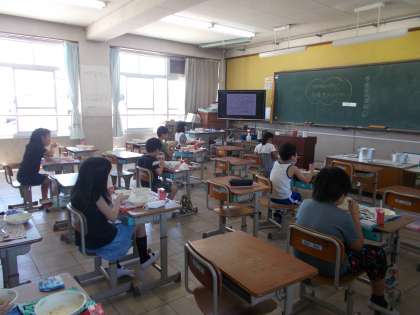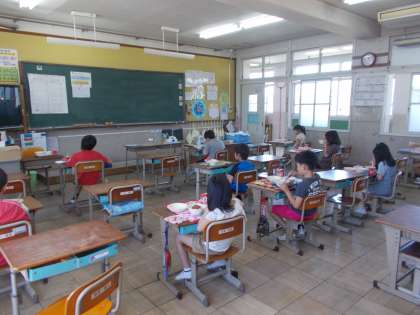 学校が再開し,久しぶりの給食です。コロナウイルス対策で写真のように,間隔をあけて食べています。いつもの給食とはすこし違うかもしれませんが,みんな給食が楽しみな様子でした。久しぶりの給食の献立は,むぎごはん,トマトだごじる,おからさばどんぶりのぐ,ぎゅうにゅうです。おからさばどんぶりのぐとむぎごはんの相性はバッチリでした。トマトだごじるは味もおいしくて色もきれいでした。みんなおいしくいただきました。明日以降も給食が楽しみです。