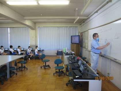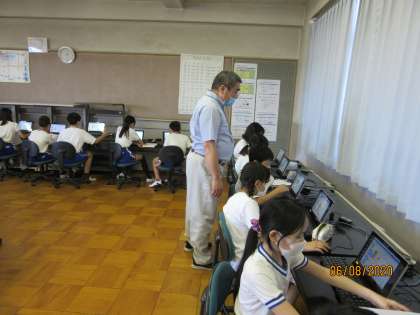 コンピュータ室で5年の時に休校になりできなかったプログラミング「正多角形をかこう」を校長先生に教えてもらいました。
