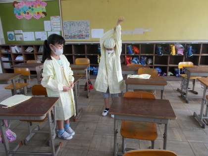 給食当番のエプロンのたたみ方を動画を見ながら実践。