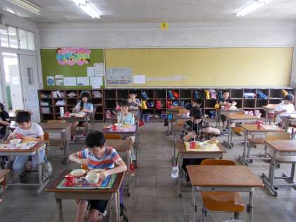 食べている間は,食器にスプーンがあたる音が教室に響いていました。