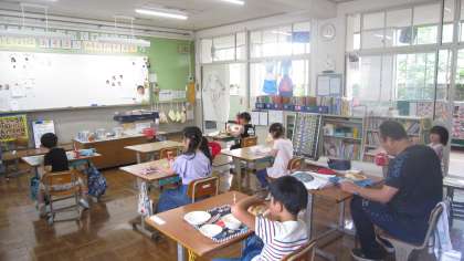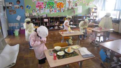 給食準備と給食,少しずつ慣れていけるといいですね。