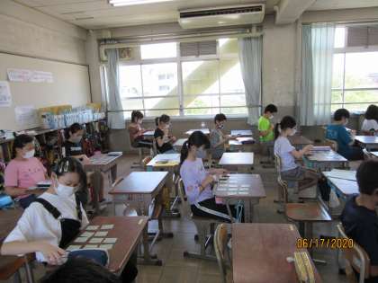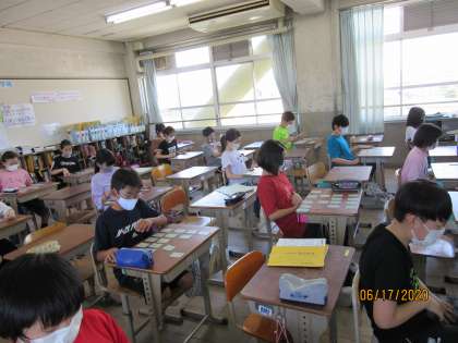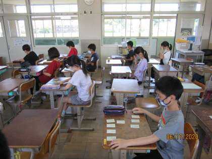 家庭科のミシン縫いを2グループに分けて学習するために,一方のグループは百人一首,言葉の意味調べと算数「対称な図形」の復習に取り組みました。百人一首は,青の札20枚を机の上において,今のところ,一人で取るようにしています。上の句で札が取れるように練習を続けていきたいと思います。