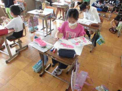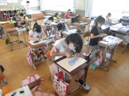 図工の時間には,学校の登下校や体育の時間などで自分が履いている「お気に入りのくつ」を画用紙にデッサンしました。靴の形や特徴をじっくりと見て,細かいところも丁寧にデッサンしました。靴のひもや靴の模様,デザインなど絵に描くことに集中して取り組みました。絵の具を使って作品を仕上げていく予定です。お気に入りのくつの素敵な作品ができそうです。