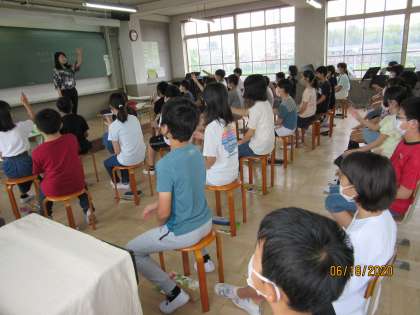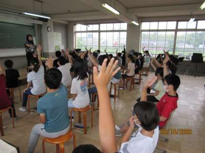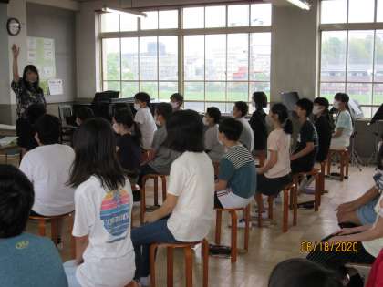 昨日の木曜から,中学校の山口先生の音楽の授業が始まっています。音楽に合わせて指揮をしたり,発声練習を楽しく行うなど楽しい時間となりました。