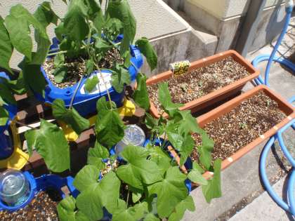 1年生のあさがおの隣には,先週植えた「ミニひまわり」。