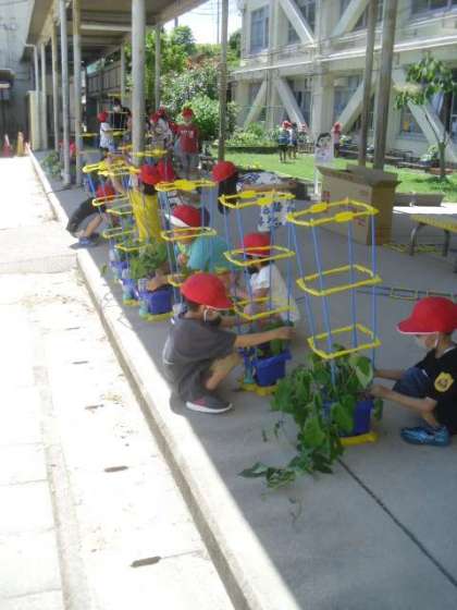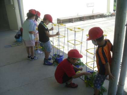 アサガオのツルが伸びてきて,植木鉢よりも下に垂れたり,友だちのツルと絡みそうになったりしていました。