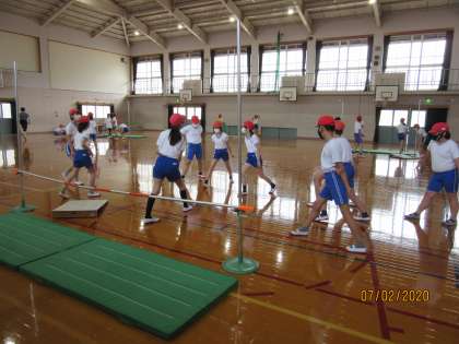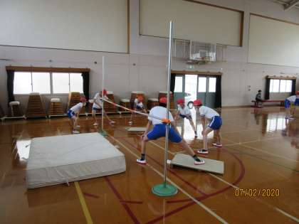 走り高跳びの準備運動をグループで行っています。走り高跳びで使う手足を意識して準備運動を考えて取り組んでいます。