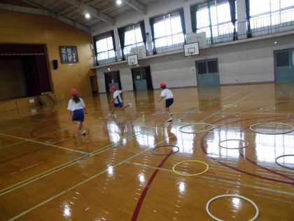 輪っかの中をとんでわたっていったり,ゴムとびをしたりしました。