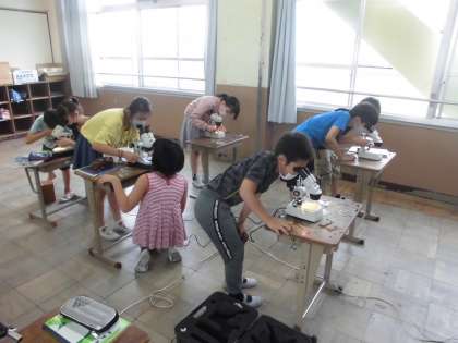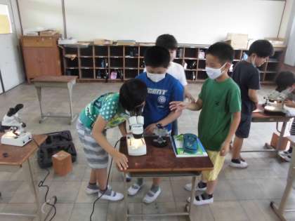 双眼実体顕微鏡を使って驚きの子どもたち。今日の学習で観察したものは,食塩・ザラメの結晶・海岸の砂・糸・脱し綿・教科書の絵などです。きれいな粒が輝く世界やきらきら光る世界,小さな点が集まっている世界,細かな繊維がいくつも見える世界など,科学の不思議さに大きな歓声が上がっていました。