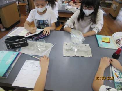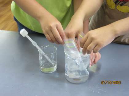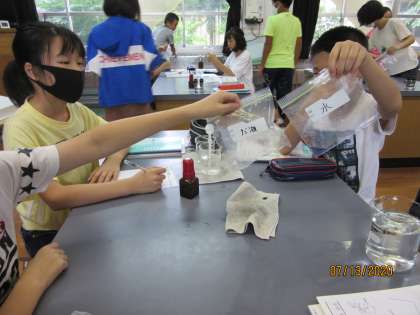 2つの袋にごはんを入れて,ふくろの上からご飯をつぶし,だ液を入れた袋と水を入れた袋を準備して,湯に入れて,ヨウ素液を入れて調べました。