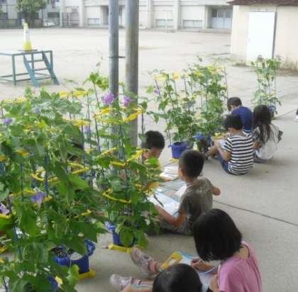 たくさん雨がふったからか,アサガオがぐんぐん大きく育っています。