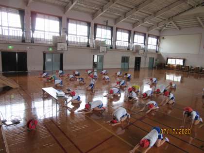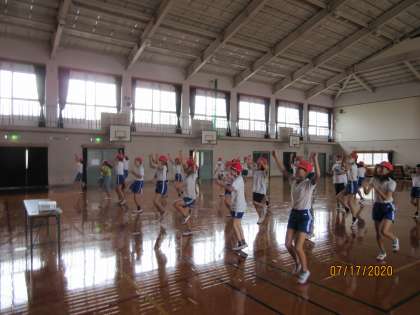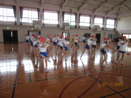 アニメ「タッチ」の音楽に合わせて踊るのは2回目です。ピッチャーとしてかまえたり,バッターとしのポーズなどを表現しながら楽しくダンスをすることができました。