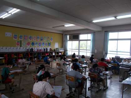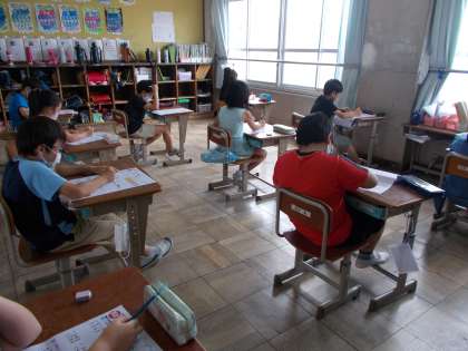 このようにみんな運動場の窓側を向き,座席の感覚をいつも以上に空け,テストをしています。