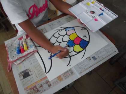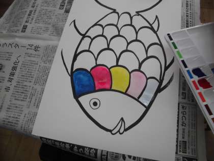 赤・青・黄を使って魚のウロコを丁寧に塗っていきました。