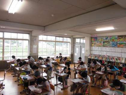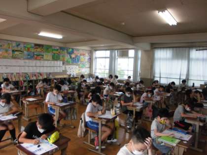 台風10号の接近が心配されていることをニュースなどで見たりしていたことと思います。今日の理科の学習では,台風と防災の単元テストをしました。台風に関する情報を正確に集めることや台風による被害に備えて,自分たちにできることを考えておくことも大切です。学習したことをこれからの生活に生かすことができるようにしてほしいと思います。