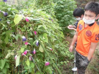 理科の学習では,「種子のでき方や実のでき方」をアサガオを中心に学習しています。アサガオの花のつくりを実際の花を詳しく観察することを通して,めしべが花の中心に一本あることや,おしべがめしべの周りに5本あることに気が付きました。また,学校園などにあるいろいろな花(サルスベリ・ツユクサ・ツルレイシ・オクラなど)の様子も観察をしました。いろいろ比べるとおしべやめしべの特徴が見えてきました。
