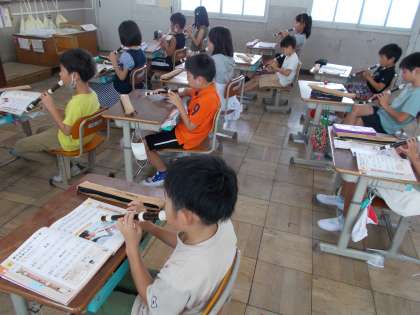 音楽の授業 公開日 2020/09/14 更新日 2020/09/14 3年生の部屋 今日の音楽の授業は,リコーダーでソ・ラ・シ・ド・レの音を使った曲を練習しました。出来るだけ子ども達の間隔をあけて,リコーダーの音を出しています。高い音と低い音のタンギングの違いにも少しずつ気付いてきました。次の曲では,鍵盤ハーモニカや木琴と音を合わす練習が始まります。