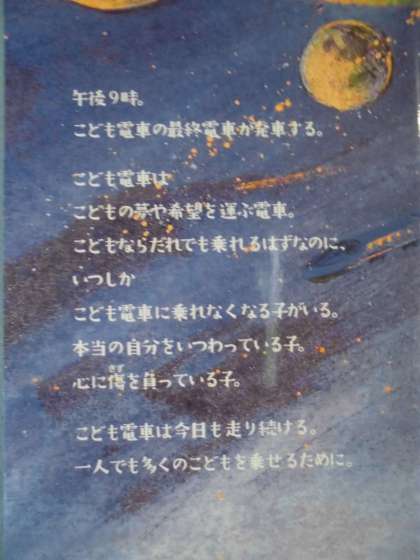 図工の時間には,お話を絵にするコンクールに向けての作品作りに取り掛かろうと思います。今年の5年生の選定図書は,「こども電車」という本です。午後 9 時。こども電車の最終電車が発車する。こども電車はこどもの夢や希望を運ぶ電車。こどもならだれでも乗れるはずなのに、いつしかこども電車に乗れなくなる子がいる。本当の自分をいつわっている子。心に傷を負っている子。こども電車は今日も走り続ける。・・想像を膨らませてお話の絵を描いていきたいです。