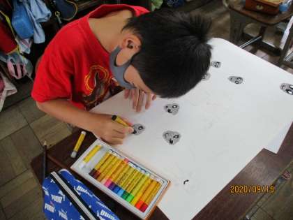 お話に出てくるねずみや鉛筆,宇宙人を,思い思いの道具を使ってかいています。