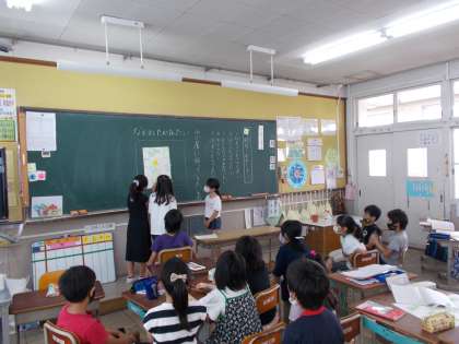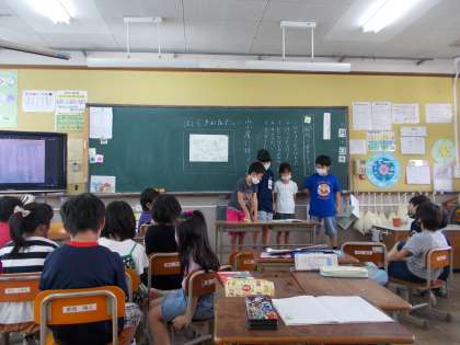 今日の3時間目に,各探検隊で決めた「山小屋で三日間過ごすため」の5つのものの発表会をしました。