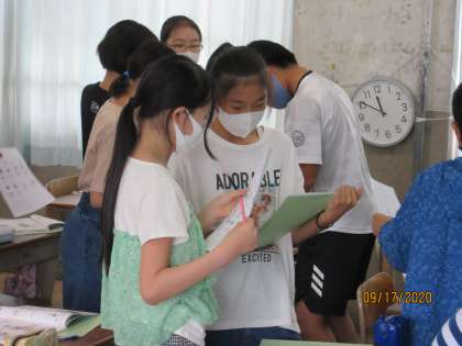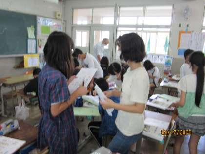 今日の4校時の外国語の時間に,ALTのポール先生に来ていただきました。「My Summer Vacation 」の単元の学習で,相手に夏休みにしたことをたずねる練習をしました。アニメなどのキャラクターが夏休みにしたことをプリントを見ながら伝え合いました。にこやかに交流している姿がよかったです。