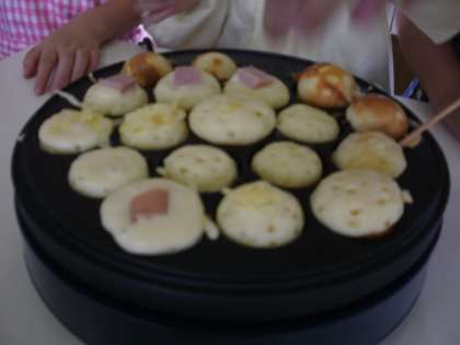 生地をたこ焼器で焼いてみました。こちらも,好きな具材を入れて焼きました。