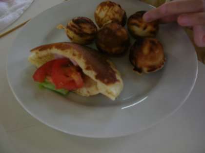 普通にホットケーキを焼いた後,半分に切り,中に切り目を入れ,好きな具材をはさみました。(具材は,レタス,トマト,ハムでした)