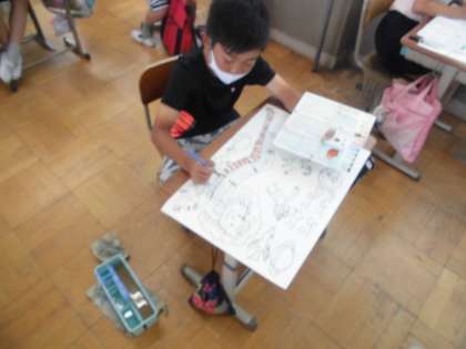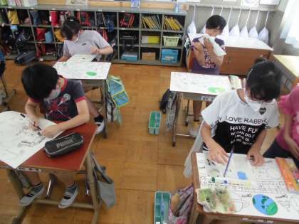 図工の時間には,お話を絵にするコンクールに向けての絵を描いています。今年の5年生の選定図書は,「こども電車」という本です。子どもたちは,描きたい場面を想像を膨らませ,自由な発想で構図や表現の工夫をしながら描いています。子どもたちの心が込められた素敵な作品が出来上がってきました。