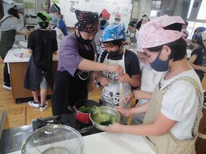 家庭科の学習では,ゆでる調理について学習しています。今日は,青菜のおひたしとゆでいもをつくりました。