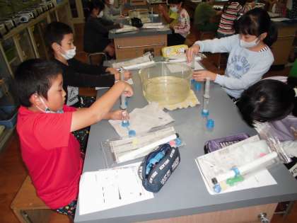 注射器に空気が入らないように水を入れ,ピストンをおします。