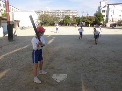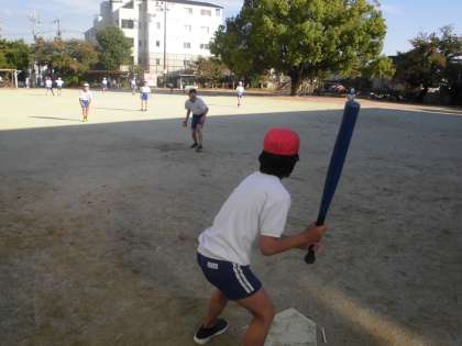 さわやかな秋空の下,元気いっぱいにベースボールを楽しみました。子どもたちもどんどん上達し,ルールにも慣れ,黄色のスポンジのボールがいつも以上に遠くに飛んでいる気がしました。たくさんの点数をとることができたチームや守備のほうでもアウトを上手にとることができるチームも増えてきました。