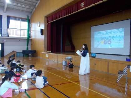 本日の3校時目に,「かんこくGO」という韓国の留学生さんのお話しを聞いたり,実際に韓国の遊びを体験したりと,韓国について異文化交流学習を行いました。写真は,韓国の留学生さんのカンダヨンさんのお話しを聞いているときのものです。貴重な異文化交流の機会となり,子どもたちも興味津々でした。
