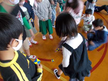 「かんこくGO」の時間の後半に,韓国の遊びである「タッチチギ」を体験しました。「タッチチギ」は,2枚の折り紙で作った「タッチ」を使う遊びです。日本のめんこに似た遊びでした。子どもたちは自分のタッチを作って,楽しそうに遊んでいました。
