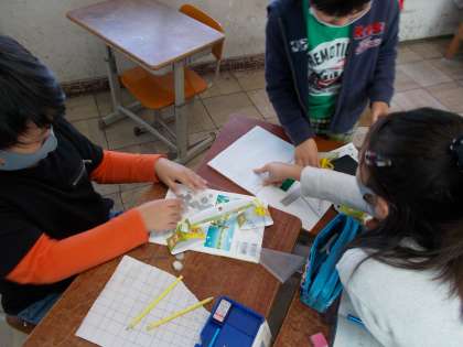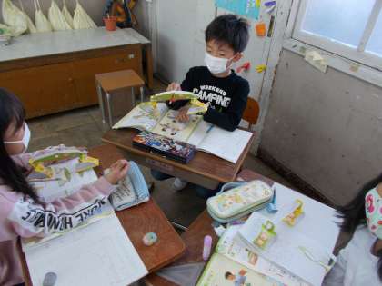 まずは,教科書の付録の天秤を使っての重さくらべ,1円玉を使って身の回りの文具の重さを量りました。1円玉が●まい分=●g,班で協力して重さを出しました。