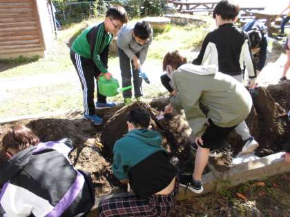 自分たちの班ごとに,小さな山をつくり,,水の量を考えながら水を流して,土地が変化していく様子を観察実験しました。流れる水には,土地を削る働きや土や石を運搬する働き,積もらせる働きなどがあることを自分たちで確かめることができました。来週には,実際の川の様子を見学に行く予定です。校区を流れる宇治川の河原の石や堤防などを見にいきたいと思います。