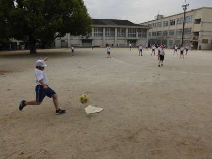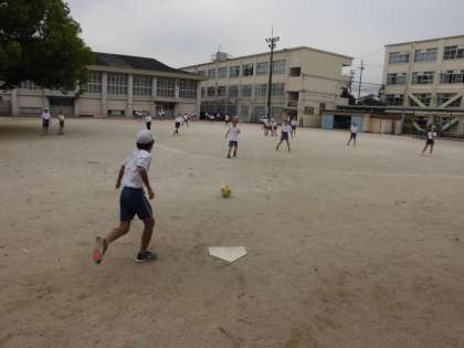 体育の学習では,ベースボール型のルールでの運動を楽しんでいます。キックベースボールでは,力強くボールを蹴り,迫力も増してきました。試合の勝ち負けだけでなく,チームワークやヒットを打つコツ,守り方の工夫などをめあてに,全力でがんばっています。