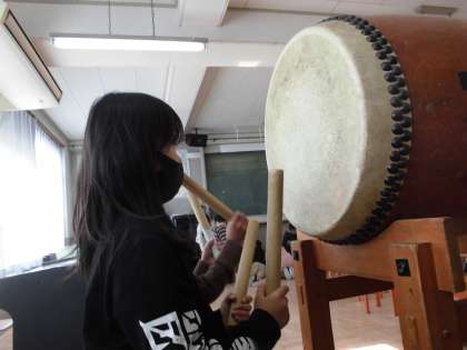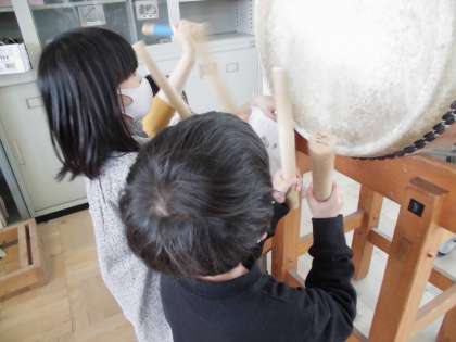 自分たちで作ったおまつりの音楽を太鼓を使って演奏しています。