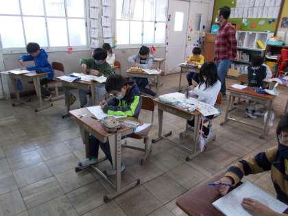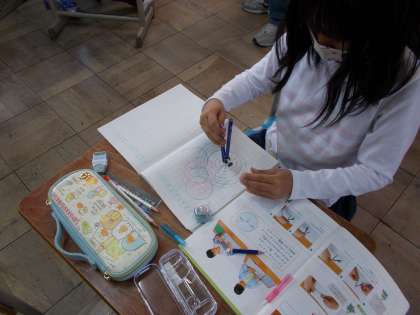 算数の学習でコンパスを使いました。早く使いたくて仕方がない子ども達,教科書に載っている順番をしっかりと確認しながら,正しくかく方法を学びました。両手を使ってしまったり,ぐっと握ってしまってコンパスの幅が変わっってしまったりとまだまだ使い方が安定していませんが,練習をたくさんして上手になっていきたいと思います。