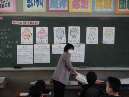おやつの中には,自然の食べ物(果物・イモ類・するめ・たまご・おもち・おにぎりなど)やカルシウムの多いもの(牛乳・チーズ・ヨーグルト・昆布・小魚など)などもあるようです。また,砂糖の多いものや油の多いもの,塩の多いものなどもあります。虫歯や,食べすぎ,健康などに気を付けて,おやつの食べ方を工夫していくことができればと思います。