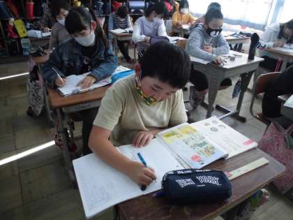 国語 漢字の広場 公開日 2020/11/19 更新日 2020/11/19 4年生の部屋 3年生の漢字を使って,文章を書きました。 ちょうど単語が29個あったので,1人1単語で,読み方を確認しました。 絵に関連した単語が書いてあるので,単語をたくさん使って一つの文にすることができます。 最低2つ以上,使える人は,すべての単語を使って文章に表していました。