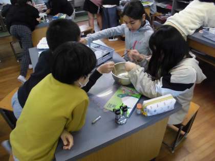 今日の理科の実験では,水の温度を上げると食塩のとける量は増えるだろうか?ということを実験を通して考えました。子どもたちの予想では,温度が高いと溶けやすいので溶ける量は,増えるだろう。という予想が多かったです。理由は,アイスクリームも温度が高いとすぐに溶けてしますから。紅茶に入れる時の砂糖もすぐに溶けるから。あめを口に入れると溶けていくから。50MLの水では20グラムの食塩でとけ残りが出ていたが,温度を上げると溶けるだろうときちんと根拠をもって予想していました。