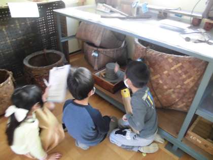 総合的な学習の時間に昔の道具の学習をしました。学校の郷土資料室に行って,昔の道具をたくさん見学しました。炊事や洗濯,照明など昔の知恵や工夫に触れることができました。子どもたちも夢中になって見学していました。