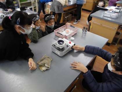 今日の理科の実験では,ミョウバンの水溶液を蒸発させる実験をしました。前時にろ過した水溶液を蒸発皿の中に数滴入れ,カセットコンロを使って加熱していきました。子どもたちは,ろ液の変化を興味深く観察実験をしていました。