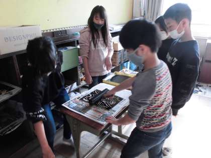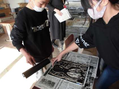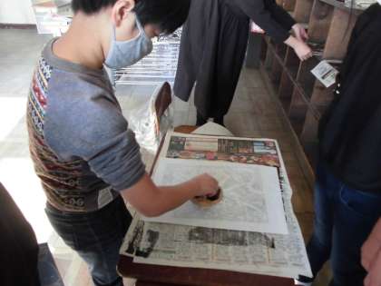 彫り終えた人がいよいよ和紙にうつす作業に入りました。