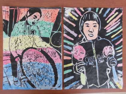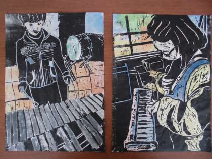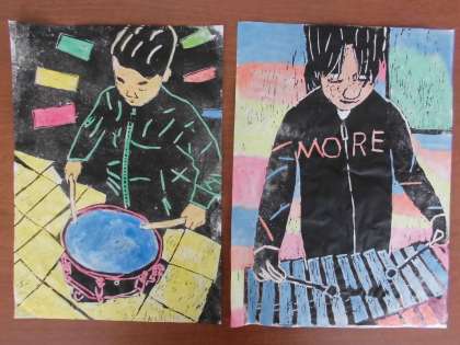 図工の学習では,版画「カラフルハーモニー」に取り組みました。作品のテーマは,学集発表会の発表などをテーマに「カラフル ハーモニー」という作品が完成してきました。素敵な音楽の世界の中で,いろいろな楽器を奏でている自分の姿を表現するように,線彫り・面彫りを組み合わせて彫り進めました。
